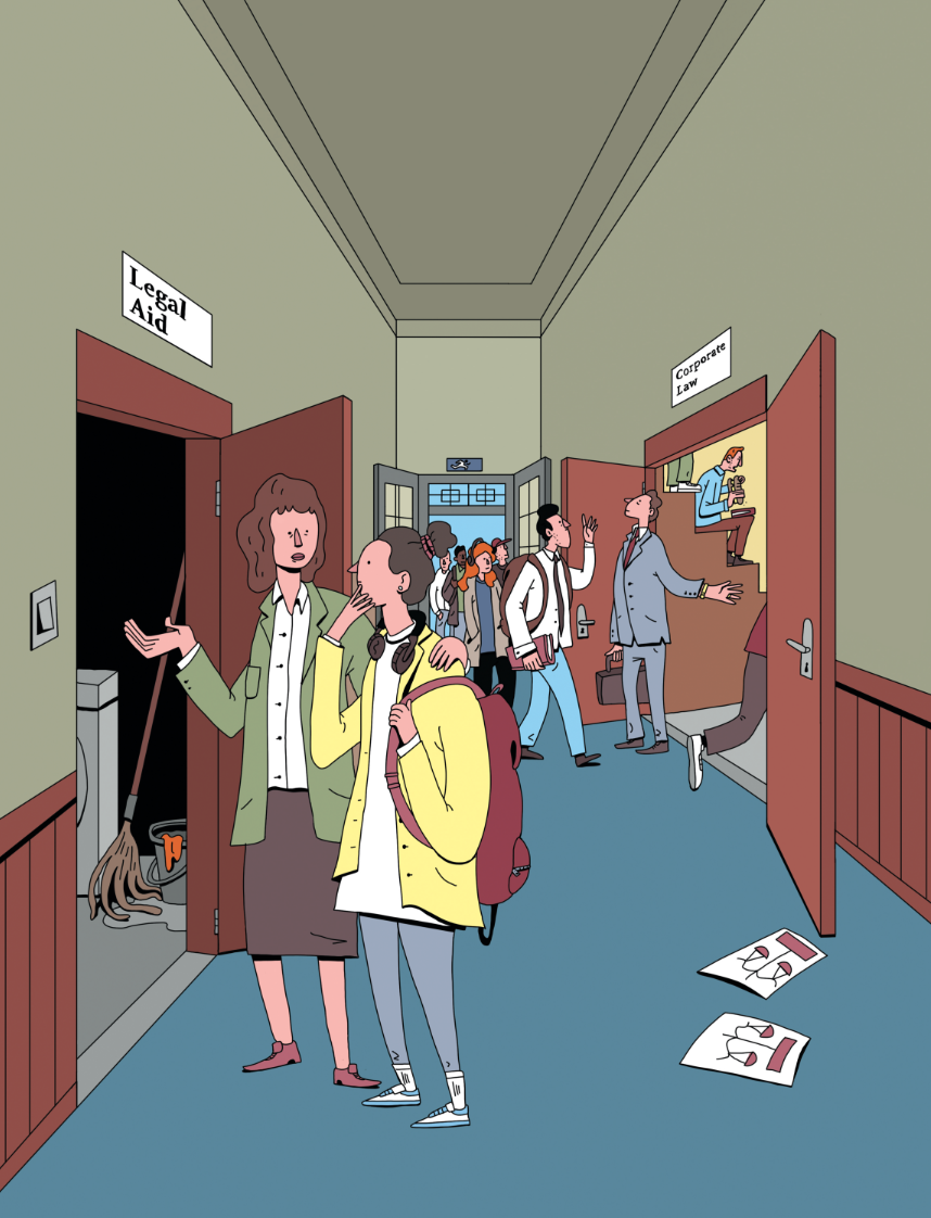 Wibier vindt dat alle rechtenfaculteiten zich moeten afvragen hoe zij kunnen bijdragen aan het tekort in rechtsbescherming dat mensen met een kleinere beurs vaak ervaren. ‘Dat moet structureler en urgenter. Het is logisch dat de grote commerciële kantoren goed zichtbaar zijn, want een groot kantoor heeft nu eenmaal meer marketingmogelijkheden. Bovendien heeft de Zuidas-advocatuur natuurlijk heel wat te bieden aan jonge advocaten. Een goede opleiding, een goed salaris, uitdagend werk. Ik denk dat dit voor veel studenten aantrekkelijk is. Maar ik ben er ook van overtuigd dat er een groep studenten is waarvoor de sociale advocatuur een aantrekkelijke optie is. Waar het om gaat, is dat studenten zich bewust worden van de mogelijkheden.’