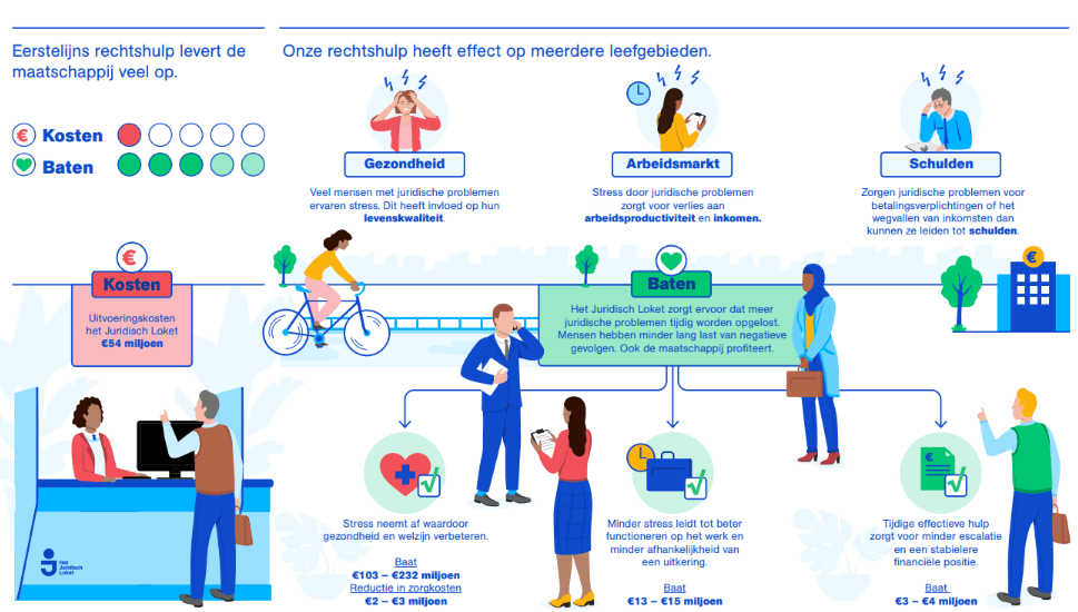 Tegenover deze kosten staan volgens SEO substantiële maatschappelijke baten, vooral doordat meer juridische problemen worden opgelost en sneller tot een einde komen. De grootste baten hebben betrekking op gezondheid en welzijn: juridische problemen veroorzaken veel stress, waardoor de levenskwaliteit vermindert.